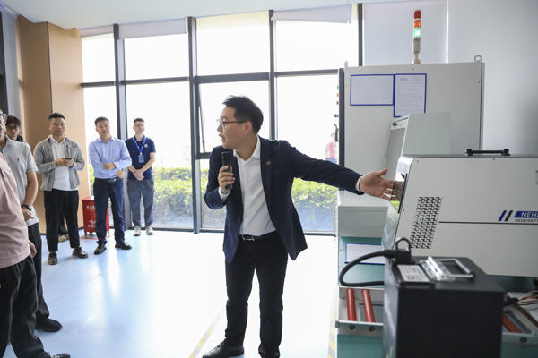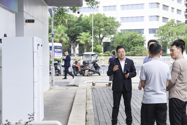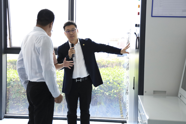 8868体育股份副董事长兼总裁刘作斌带领客户嘉宾参观、体验电动自行车、电动摩托车电池检测